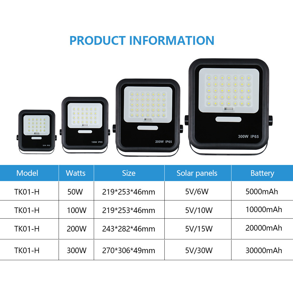| TK01-H 300W | 3.2V 30AH | 5V/6V 30W | 6-8 Hours | ABS | SMD 2835 |